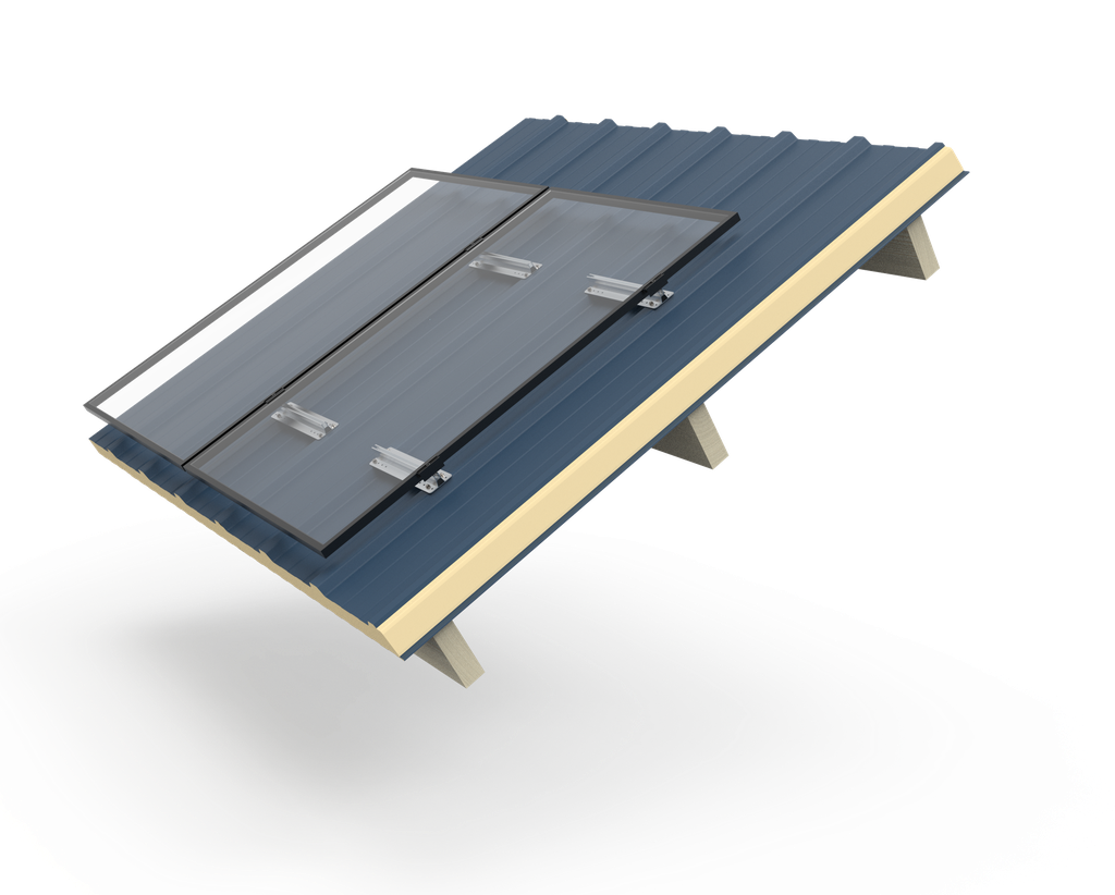 Bevestigingsplaat 'Solarail' voor het bevestigen van zonnepanelen op sandwichpanelen, met optioneel eindklemmen en middenklemmen.