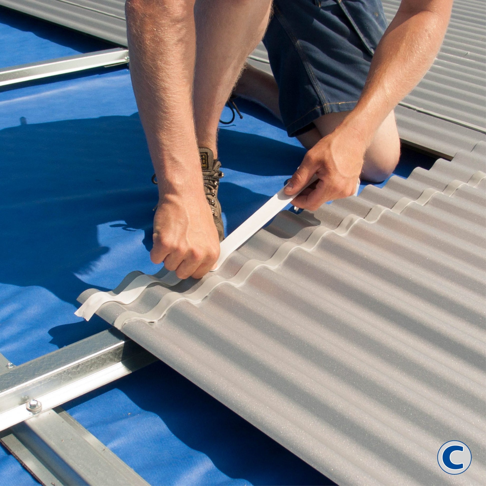 Butyl tape is used to seal the overlaps of the roof panels in a watertight manner. When overlapping in the longitudinal direction (i.e. when mounting 2 panels behind each other), this is absolutely necessary to obtain a good seal. In the photos you can find a sketch of the transverse overlap, on which the application of the butyl tape is indicated. Given the relatively low price of the butyl tape, we always recommend laying it twice in order to minimize the risk of leaks.