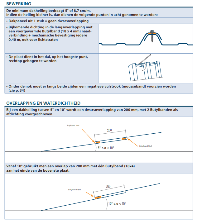 With an overlap in the width direction (ie where the panels are next to each other), the use of butyl tape is recommended to obtain a better seal, but not strictly necessary if the minimum slope of 5° (8%) is respected.