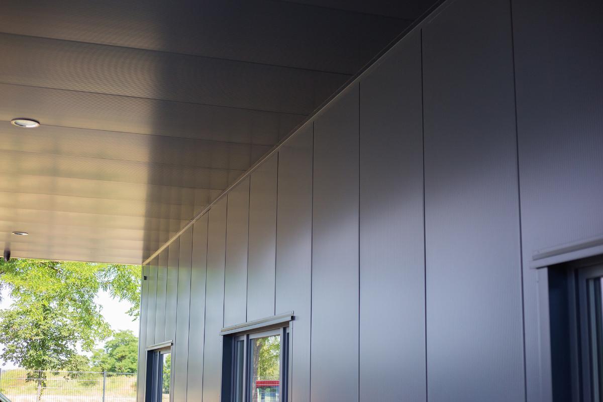 Aan binnenzijde zijn de wandpanelen steeds voorzien van een witte gelinieerde staalplaat. Aan buitenzijde zijn deze voorzien van een antracietgrijze staalplaat, met 'microrib'-liniëring.
