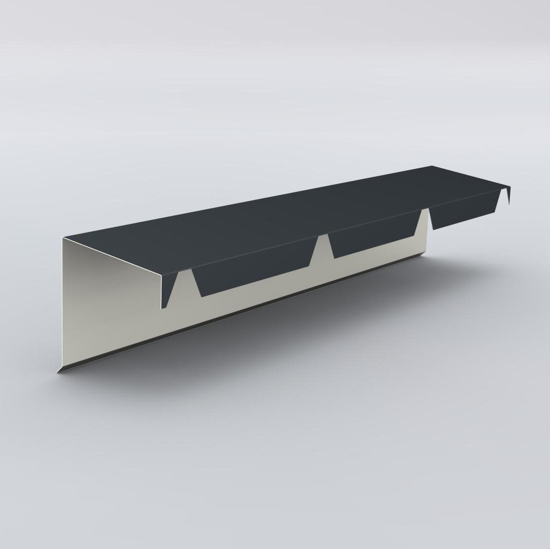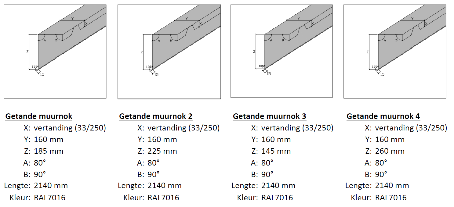 Serrated wall ridges are mainly used to finish the 'ridge side' (highest point) of detached buildings with a pent roof. Standard color is RAL7016 anthracite grey, length is 2.14m (2m opaque, 14cm overlap). The teeth are the standard 33/250 profile (fits all our roof panels from stock, both with and without insulation). It is interesting from an aesthetic point of view to combine bargeboards and serrated wall ridges of the same type (type 1/2/3/4) for the best result.