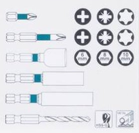 - Bits met lengte 25 mm: 1 x PH1, 3 x PH2, 1 x PH3, 1 x PZ1, 3 x PZ2, 1 x PZ3, 1 x T15, 2 x T20, 2 x T25, 1 x T30