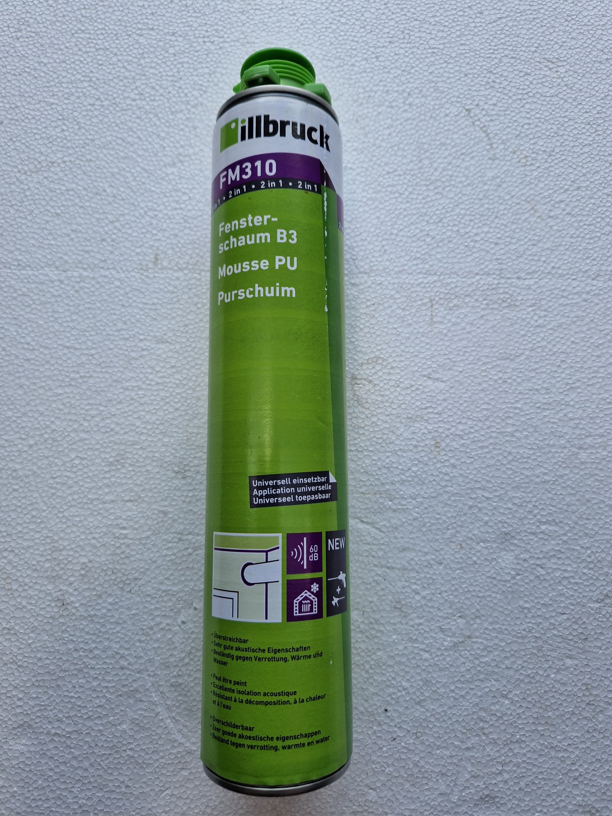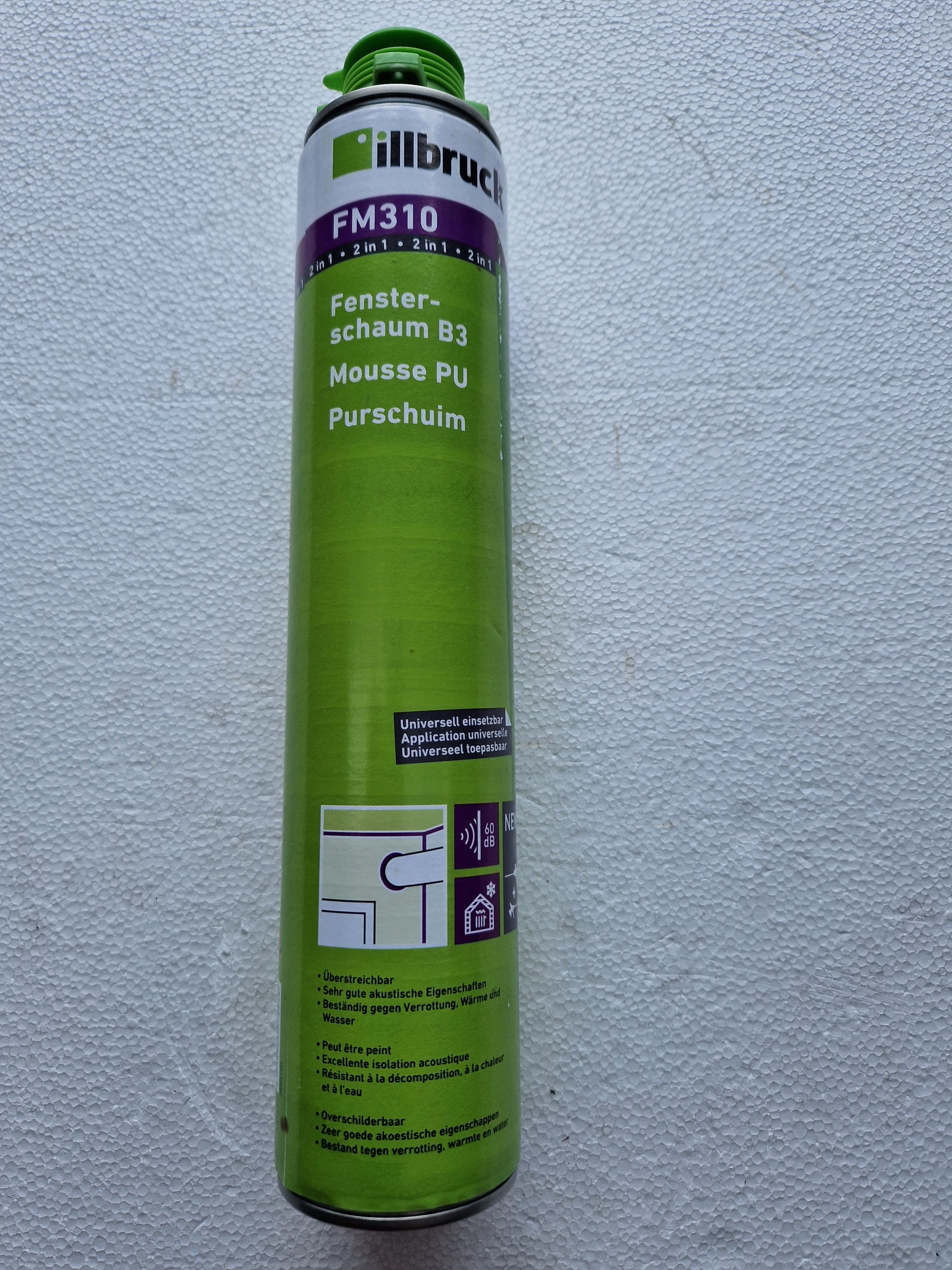 Illbruck FM310 low expansion PU foam, pack of 750ML. Suitable for foaming under pleats (for example, to avoid a thermal bridge under the flat ridge , to close any gaps between the roof panel and the wall before placing the bargeboard over it,...). Gun sold separately; when buying 12 pieces, the gun is included for free (select the option '12 pieces' in the drop-down list).