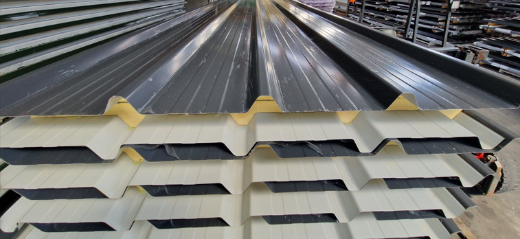 Roof panels with PIR insulation, insulation thickness 100mm, available from stock.