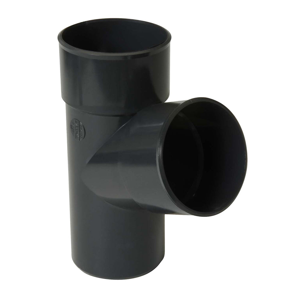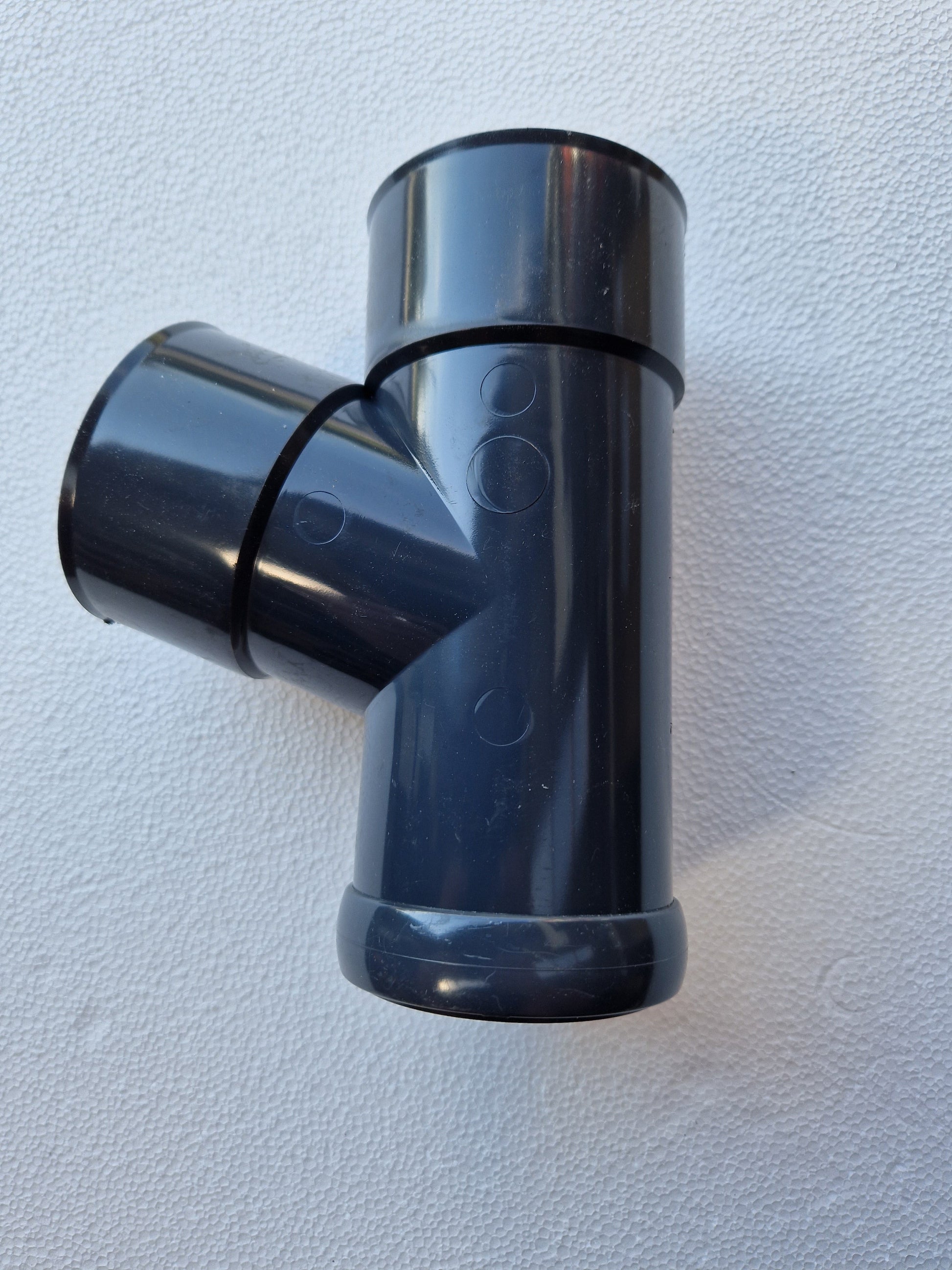 T-stuk voor afvoerbuis diameter 100mm, kleur antracietgrijs. Net zoals de afvoerbuis 80mm zijn de T-stukken in Techtan-composiet (30 jaar garantie op de sterkte). De T-stukken zijn aan de 2 bovenzijden gemoft; aan onderzijde zijn deze 'verjongd', waardoor je geen moffen nodig hebt om over te gaan naar de buis. De T staat op 67° tov. de 2 rechte stukken; om terug evenwijdig te komen kan je dus best overgaan naar een bocht 67°.