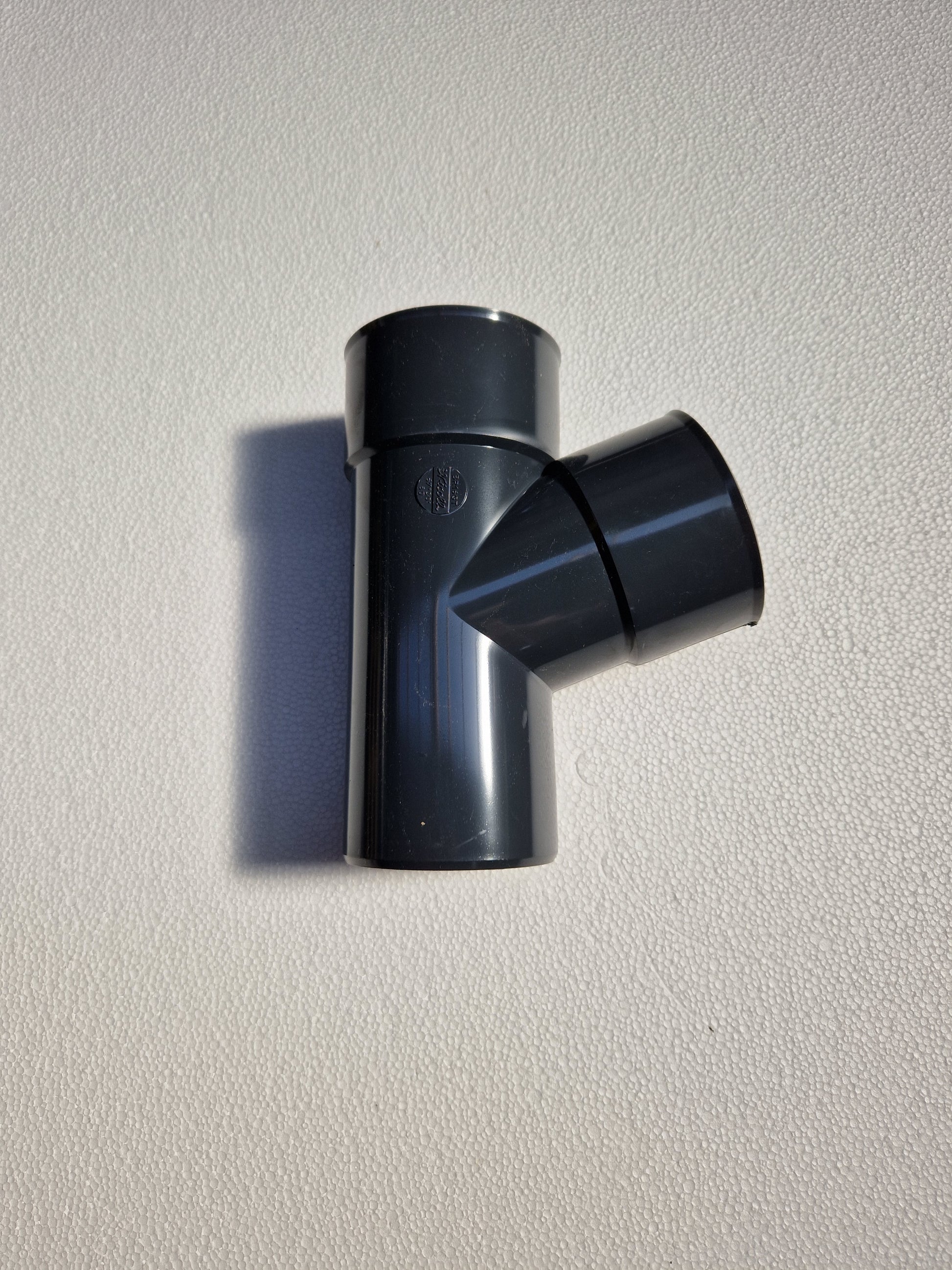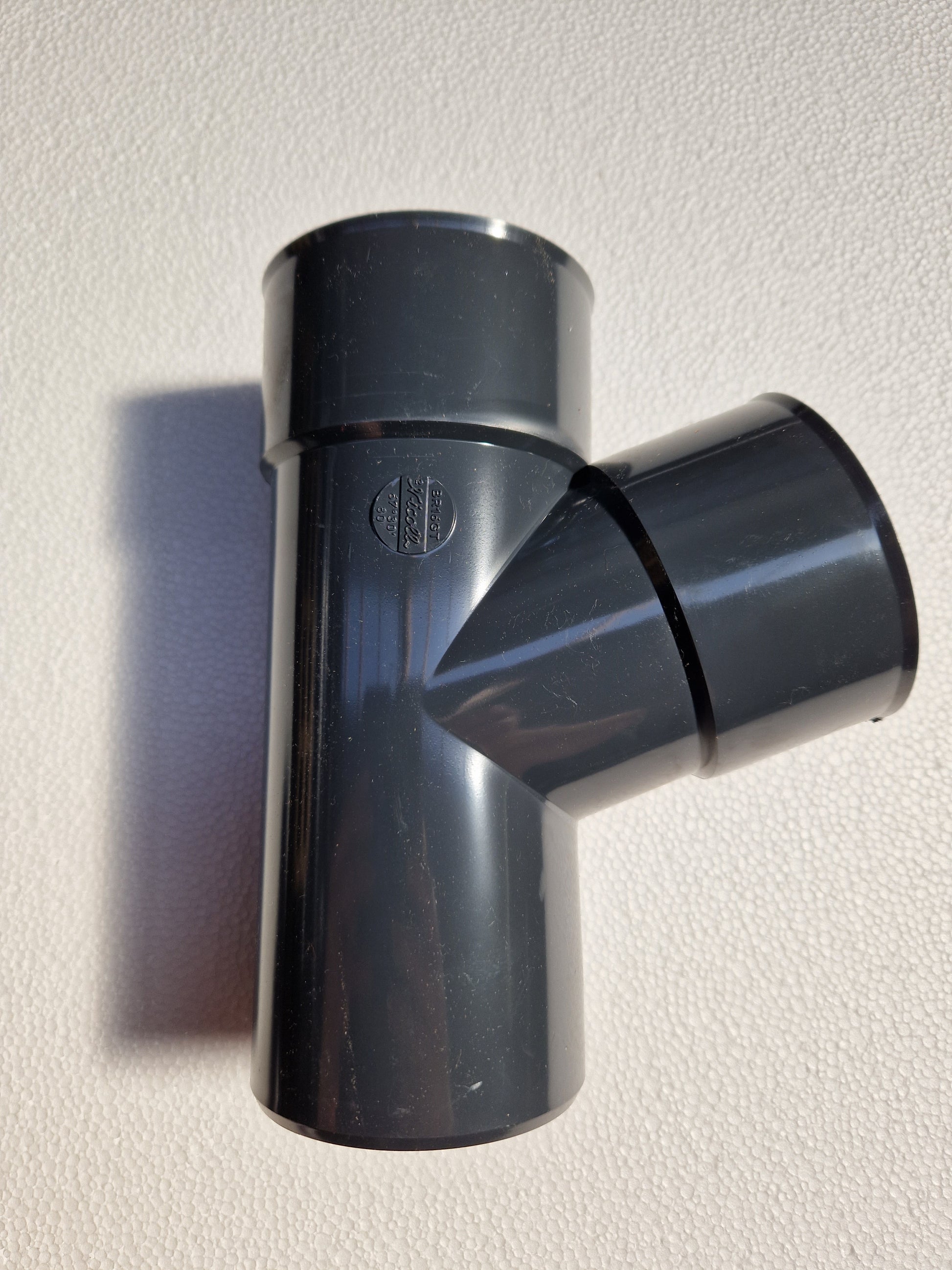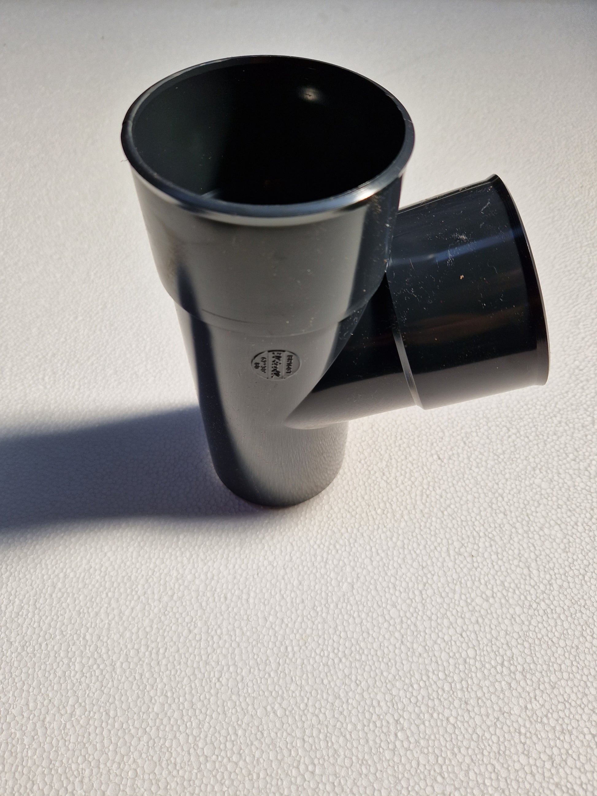 T-piece for drain pipe diameter 80mm , color anthracite grey. Just like the 80mm drain pipe, the T-pieces are made of Techtan composite (30-year strength guarantee). The T-pieces are muffed on the 2 top sides; they are smooth on the underside. The T is at 67° relative to. the 2 straights; to get back parallel it is best to switch to a bend 67° .