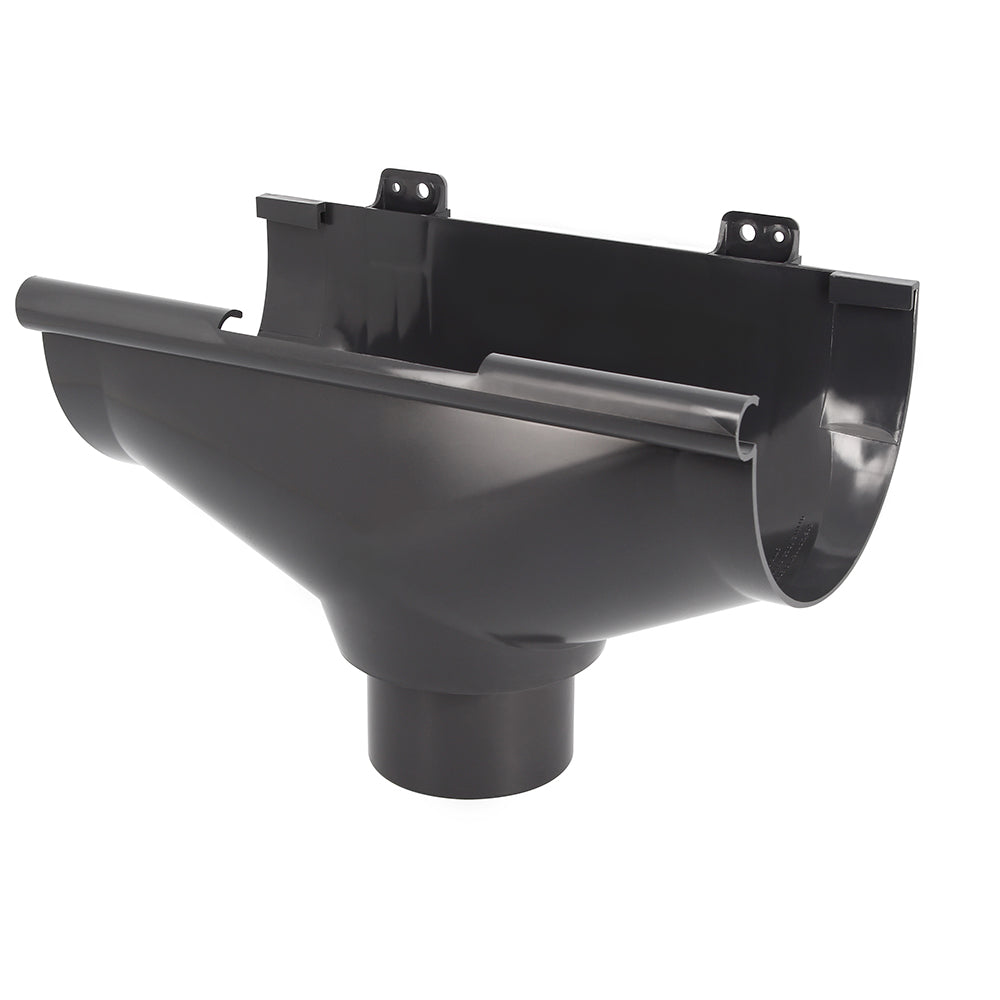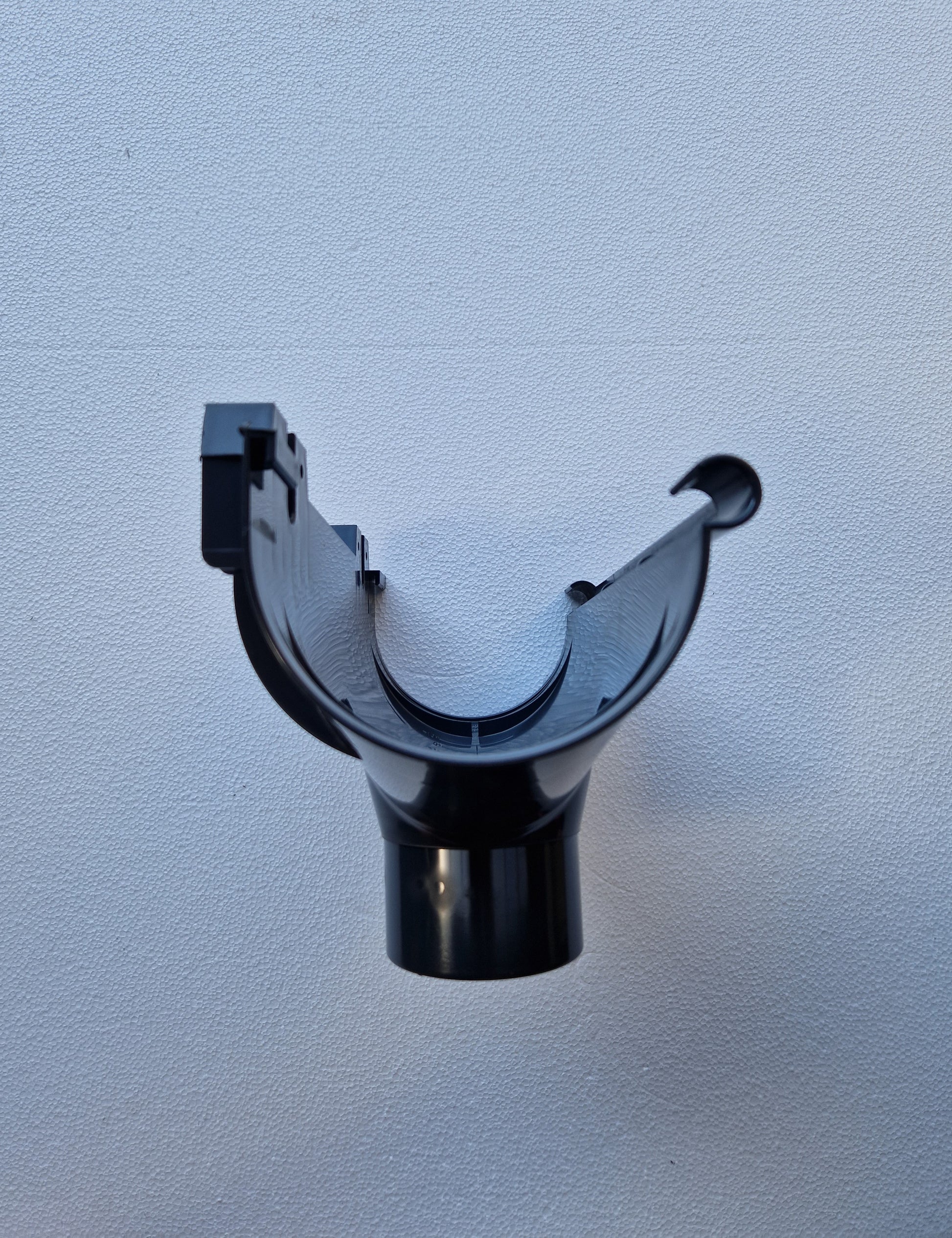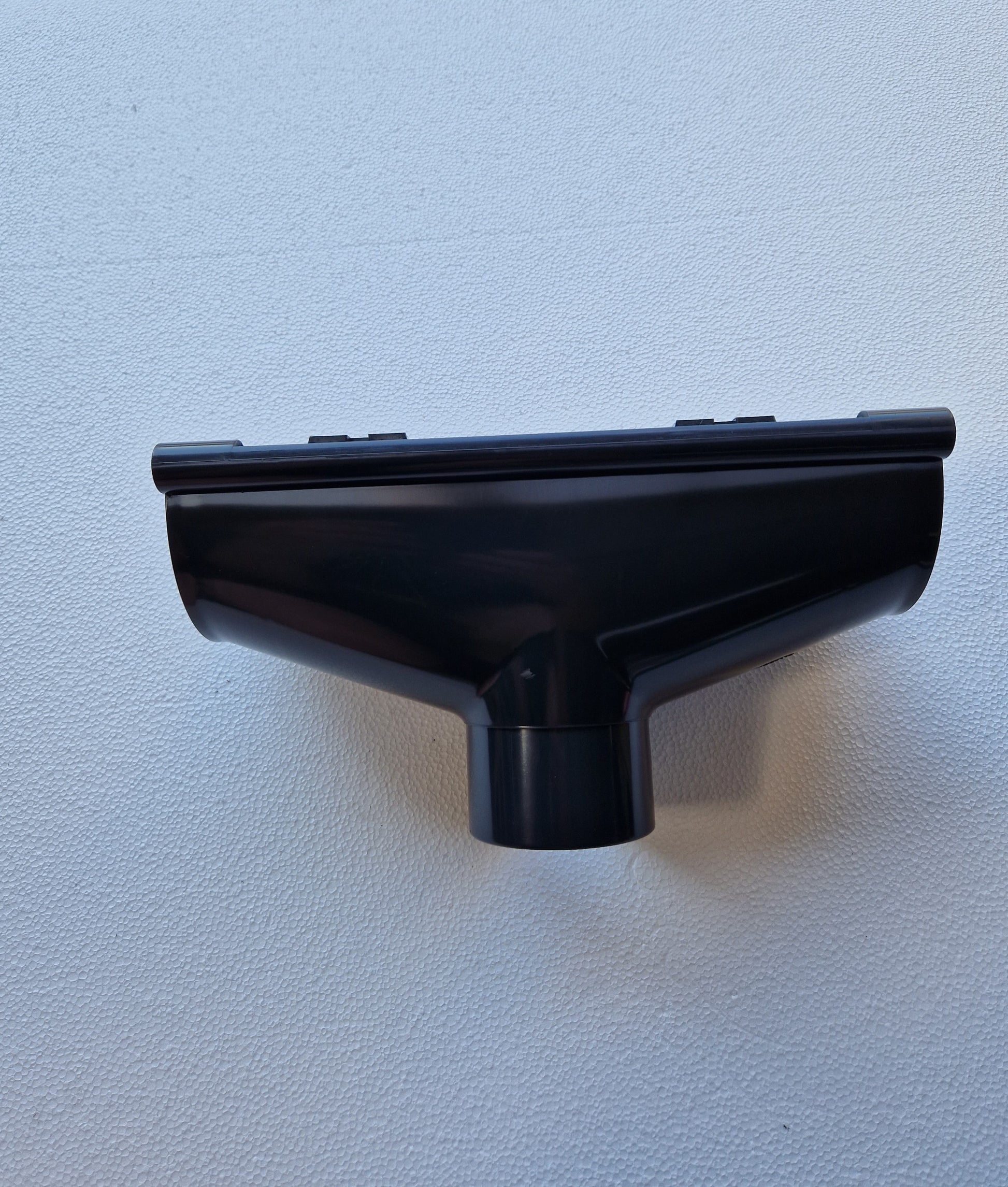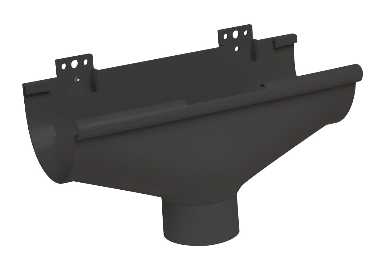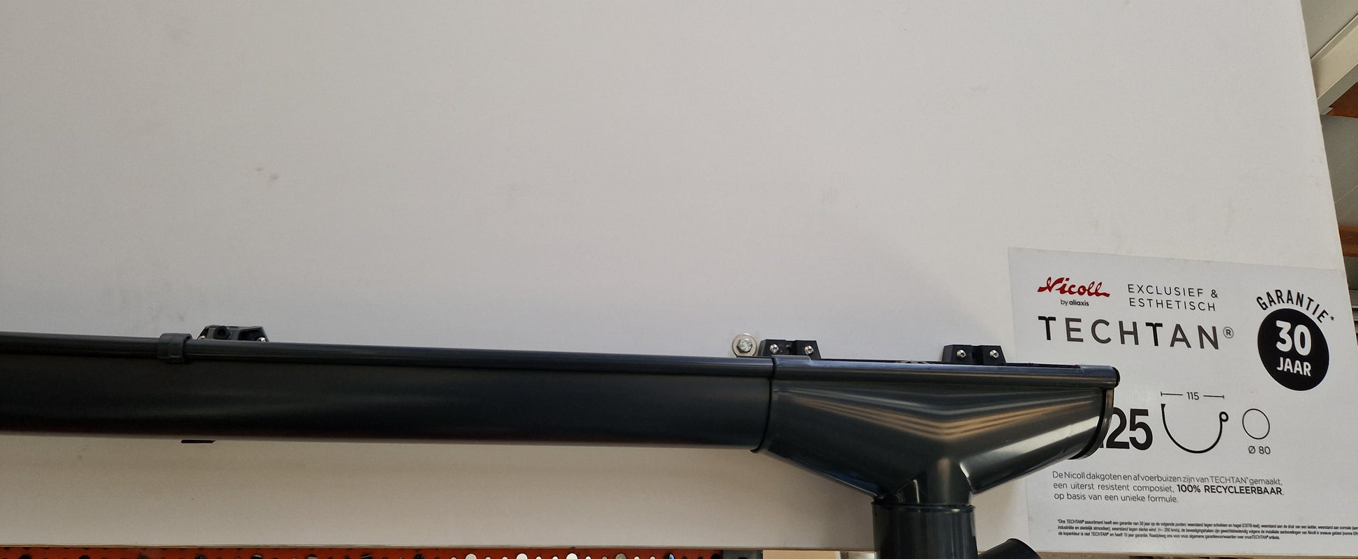 Outlet piece for the LG25 gutter system, tap hole diameter 80mm, color anthracite grey. Total width 30cm. Just like the LG25 gutter, this spout is made of Techtan composite (30-year guarantee on strength). Suitable for outlet to pipes with a diameter of 80mm . The outlet piece is provided with temperature lines: during assembly you must slide the gutter to the current temperature. In the event of expansion and contraction, the gutter can then move freely within the spout and thus regulate its expansion. It is therefore recommended not to glue the gutter with PVC glue in the outlet piece (where you have to do this with connection pieces and end pieces ).