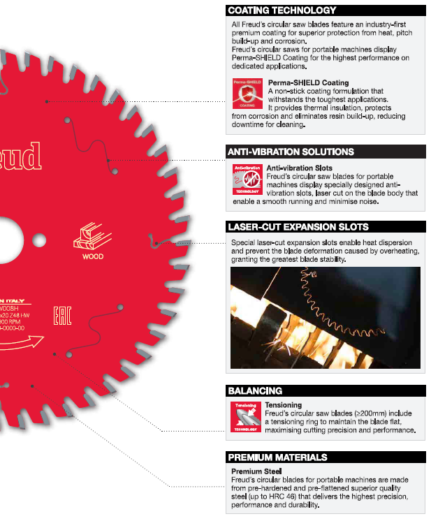 De tanden zijn carbide ipv bimetaal, en het zaagblad is zo gemaakt dat dit een veel betere warmteafvoer heeft en eventuele uitzetting eenvoudig kan opvangen.